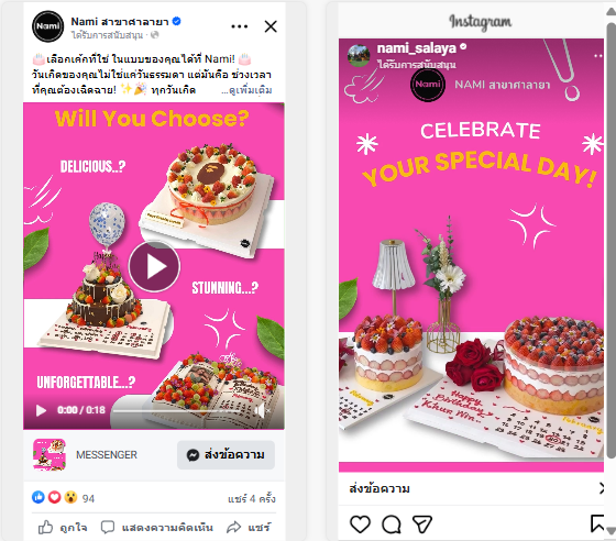 In March 2025, Digital Agency Bangkok collaborated with Nami Café, a dessert and international cuisine café, to create a single Facebook Ads campaign divided into three main posts. The campaign highlighted the café’s key offerings: birthday cakes, beverages, and international dishes. The main goal was to increase engagement and encourage customers to send inquiries. Despite a modest budget of just 9,xxx THB, careful targeting and creative planning enabled the ads to reach multiple audience segments, including existing customers and new customers with similar behaviors. The results show that designing creatives aligned with both the product and audience can effectively build brand awareness and engagement, even with a limited budget.