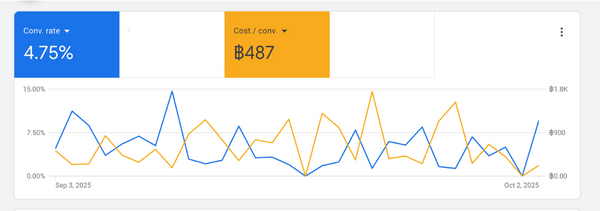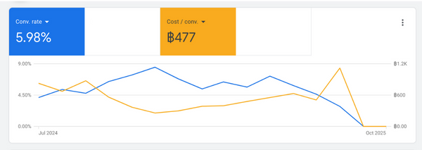 Average conversion rate reached 5.98%, with peak days approaching 9%. The average cost per conversion was 477 THB, a sustainable figure for a premium service business.