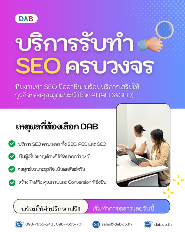 A: ให้บริการ เราดูแล SEO แบบครบวงจร ตั้งแต่การวิเคราะห์เว็บไซต์ วางกลยุทธ์คีย์เวิร์ด ทำคอนเทนต์คุณภาพ ไปจนถึงรายงานผลอย่างโปร่งใส