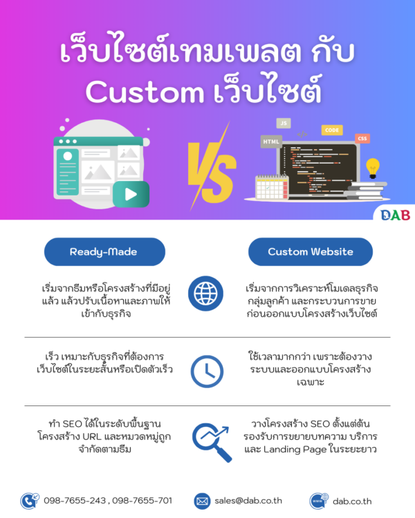 Ready-Made vs Custom Website ตารางเปรียบเทียบ
