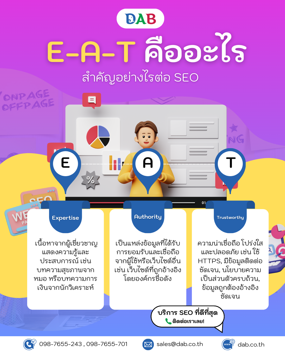 หลัก E-A-T (Expertise, Authoritativeness, Trustworthiness) เป็นหัวใจสำคัญของ SEO สมัยใหม่ โดยเฉพาะเว็บไซต์ที่เกี่ยวข้องกับข้อมูลสำคัญต่อผู้ใช้งาน การสร้างเนื้อหาที่สอดคล้องกับ E-A-T จะช่วยให้เว็บไซต์ของคุณติดอันดับสูงขึ้น สร้างความไว้วางใจ และเพิ่มโอกาสในการทำธุรกิจออนไลน์