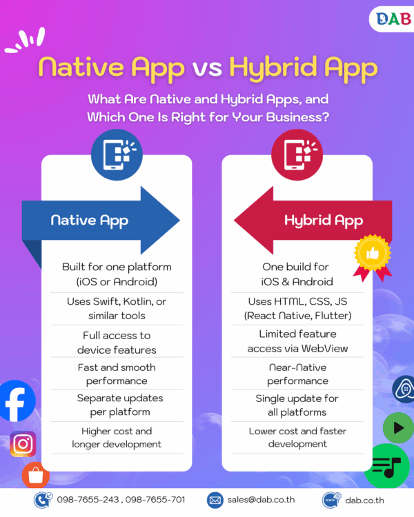 Popular examples of Native Apps include LINE, Facebook, Instagram, Grab, and Shopee. These apps are specifically developed for iOS and Android, delivering fast performance, full access to mobile features, and smooth user experience.